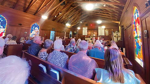 Sunlight streaming through stained glass creates a rainbow of colors dancing across parishioners seated in the east side pews.