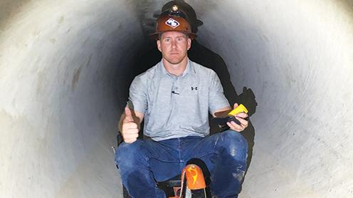 A construction worker is pictured checking the inside of the 54-inch diameter Georgia-Pacific Fenholloway pipeline close to its completion date in 2020. The Foley Cellulose Mill’s $65 million, 15.3-mile underground pipeline runs from near the mill site to a discharge point near Peterson’s Landing approximately 1.5 miles from the mouth of the Fenholloway River.