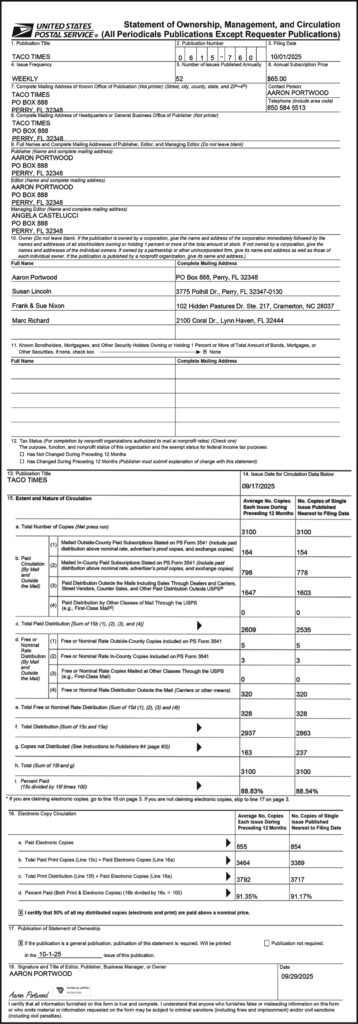 Unless such certificate is redeemed according to law, the property described shall be sold to the highest bidder in the Courtroom on the 2nd floor in the Taylor County, FL Courthouse on the 13th day of October 2025 at 11 o’clock a.m.