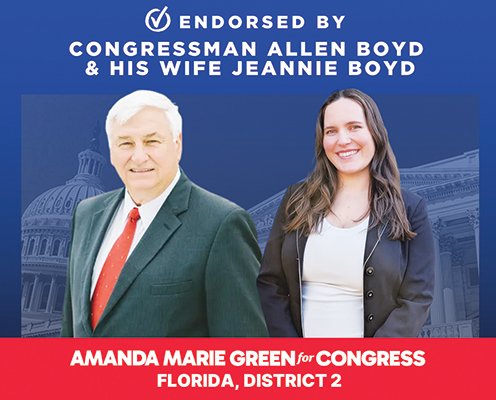 Amanda Marie Green, candidate for U.S. Congress in Florida’s District 2, has announced the endorsement of Allen Boyd, former United States Representative for Florida’s 2nd congressional district, and his wife, Jeannie Boyd, citing Amanda’s commitment to fixing Congress and her dedication to the people of North Florida.