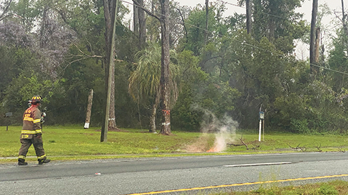 A tree limb fell on a power line just north of the intersection of Highway 19 North and Ash Street when a line of severe thunderstorms moved through the area Monday. City of Perry Fire Department Fireman Charles Watson kept a watch on the downed line while waiting for a power company crew to arrive on scene. Officials reported at least one home getting struck by lightning during the storm, as well as “three or four” additional downed power lines.